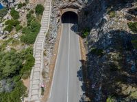 This image showcases an aerial view of an elevated road in Mallorca, one of the Balearic Islands in Spain. The straight road stretches through the scenic landscape of the island, surrounded by nature. The high aerial perspective gives a top-down view of the road, revealing its length and the surrounding terrain. The road leads towards a tunnel, adding to the intrigue and curiosity. This photo captures the beauty of Mallorca's road infrastructure, offering a unique perspective of Europe's stunning landscapes.