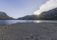 A sunny day in Mallorca, Balearic Islands. The clear sky reflects on the surface of the lake, surrounded by mountainous landscape. The open space and wilderness provide a tranquil escape into nature.