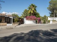 A modern residential street in Mallorca, Balearic Islands. The clear sky highlights the beautiful architecture and landscape of the village. Nature surrounds the city with three bushes on each side of the road. A perfect day in Europe.