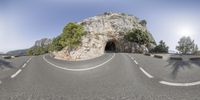 a fisheye lens photo of the road and tunnel near the trees on the side of a mountain
