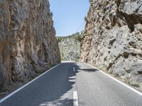 This is an image of a straight road on the Balearic Island of Mallorca, Spain. The road is made of asphalt and stretches through the pristine natural landscape of Mallorca. The clear sky above adds to the scenic view of the European countryside. This photo captures the essence of a sunny day in Mallorca, with its picturesque and serene surroundings.