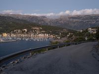 This is an image of a coastal landscape in Mallorca, Spain. The photo was taken at dawn, with the first light of day illuminating the mountains and ocean. The asphalt road leads to a pier and harbor, with street lights and artificial light creating a serene atmosphere. In the distance, you can see a jetty and Armco barriers to protect the coast. The clear sky provides a beautiful backdrop to the scene. This photo captures the natural beauty of Mallorca and the Balearic Islands in Europe.