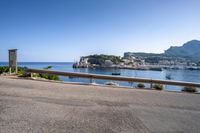 A coastal road in Mallorca, Spain, with clear skies and the beautiful Balearic Islands in the background. The road is lined with Armco barriers and leads to a picturesque pier and harbor. A perfect day to explore the stunning natural landscape of Mallorca.