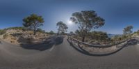 Curved road along the coastal landscape of Mallorca, Balearic Islands. Mountains and clear sky create a picturesque backdrop. The road is lined with trees, with one growing on top of it. A perfect day for a scenic drive in Spain.