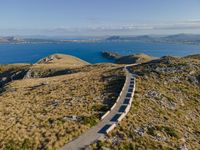 This aerial view shows an elevated road along the coastal landscape of Mallorca, Balearic Islands in Spain. The road, made of asphalt, winds its way through valleys and offers a high vantage point to admire the clear sky and the vast expanse of the ocean. Along the road, an Armco barrier provides safety measures. This photo captures the natural beauty of the European coast and showcases the unique landscape of Mallorca. It is a perfect representation of the Balearic Islands' charm and allure.