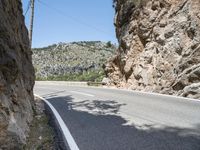 This is an image of a road in Mallorca, Spain. The asphalt road cuts through a picturesque landscape, surrounded by the natural beauty of the Balearic Islands. The clear sky and sunny weather add to the charm of the scene. This photo encapsulates the peacefulness and serenity of a day in Mallorca, showcasing the stunning landscapes that can be found throughout the island. It is a perfect representation of the natural beauty of Mallorca and the Balearic Islands.