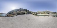 A stunning 360-degree view of the Mallorca mountain range in Spain. The clear sky highlights the natural beauty of the landscape, with a small lake nestled below. Explore the ancient history and geology of this European vacation destination.