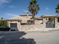 a large house with two cars parked outside it and a palm tree by the side of the road