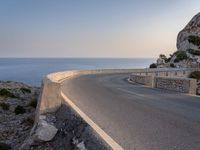A scenic road in Mallorca, Spain, stretches into the ocean from the beach. The road is lined with a low Armco barrier and offers breathtaking coastal views. Enjoy the break of day along Europe's stunning coastline.