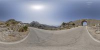 there is a panorama lens image of a curved road with the sun in the background