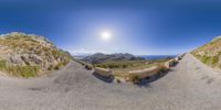 An aerial view of an elevated road in Mallorca, Spain. The road winds through the mountainous landscape, offering a straight down view of the coastal waters. Clear skies and open spaces create a serene atmosphere.