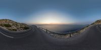 a fish eye lens of a road and the ocean at dusk in a 3d view