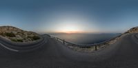 A winding road in Mallorca, Spain, leads to the top of a mountain. The Armco barrier and guard rail provide safety along the coastal landscape. The break of day reveals a sunny sky and a lighthouse in the distance.