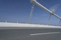 A man is riding his bicycle along the highway with a view of the blue sky in the background. The asphalt road stretches into the horizon, lined with steel bridges and infrastructure. The motion blur adds a sense of speed and movement to the image. The clear sky with contrails and the parallel lines of the road create a visually appealing composition. The black metal of the bicycle stands out against the grey atmosphere. This stock photo captures the engineering and machine-like composition of the highway, showcasing the modern infrastructure and the freedom of motion.