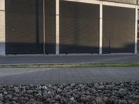This stock photo shows a man riding on a skateboard in front of a tall building with shutters on each side. The city of Berlin, Germany serves as the backdrop for this image, showcasing its modern architecture and urban design. The photo captures the essence of city life in Europe, specifically in Berlin's business district. The man rides along the road of asphalt, highlighting the contemporary facade of the building with its distinct lines and windows. The metal wall of a warehouse and an office building can also be seen in the background. The image is taken at dawn, creating a beautiful blend of natural light and artificial illumination. This photo is perfect for illustrating concepts related to urban areas, public spaces, street life, and the architectural beauty of Berlin.