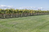 A man is standing on top of a lush green field in a vineyard, enjoying the clear blue sky. The vineyard is located in a rural area, surrounded by vegetation and woody plants. The grass surface is well-maintained, providing an open and spacious feeling. This scenic landscape is a perfect example of agriculture and farming in Ontario, Canada. The man is in Toronto, enjoying the beautiful natural environment. The field is ready for crop cultivation and is a prime location for vineyard plantation. A pole and groundcover can be seen in the background, adding to the overall picturesque setting.