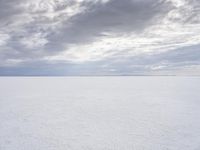 A man is seen walking across a large open field covered in snow and surrounded by cloudy skies. This scenic landscape is located in Utah, USA, known for its breathtaking natural beauty. The snowy terrain contrasts with the clear blue horizon and creates a calm atmosphere. The image captures the vastness of the open space and the endless road stretching towards the Salt Lake City. In the distance, the Bonneville Speedway can be seen, adding to the charm of this picture-perfect scene.