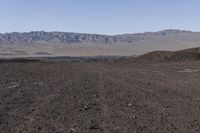 This stock photo features a man walking on a field in a desert land in California, USA. Behind him, there is a motorcycle and in the distance, a majestic mountain can be seen. The image captures the wide open space and rugged landscape of the desert. It is a perfect representation of a day in nature, with its dirt road, hills, and mountain range. The soil and gravel surface add to the wild and natural environment. The clear sky and mountain landforms further enhance the beauty of this remote and untouched wilderness. The composition also showcases the geological features like wadi, quarry, and rock surface. The mountain range gives a sense of vastness, almost resembling a volcano. Overall, this picture from Pisgah portrays the rugged beauty and tranquility of the desert landscape in California.