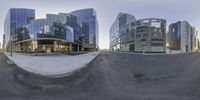 A view down a street in Manhattan, New York, surrounded by tall modern architecture. The curved road leads to a business district, with glass-walled office buildings. The dawn sky adds a touch of urban beauty.