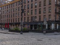 This image showcases the classic architecture and city life of Manhattan, New York. The brownstone buildings and cobblestone roads create a unique and charming neighborhood. The gloomy grey sky sets a moody atmosphere, making the scene feel like a street straight out of a movie. The residential area is filled with brick and stone facades, with windows offering glimpses into the urban design within. Vegetation and flowers bring touches of nature to the cityscape. This photo captures the essence of New York City's architecture and captures the allure of its neighborhoods.