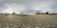 360 - pane of a concrete sculpture with geometric pattern in front of it and a large building in the background