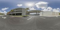 Aerial view of Miami Beach's urban design, with palm trees lining the streets and high-rise buildings casting hard shadows. The elevated road curves over the city, while pedestrians cross at the crosswalks below.
