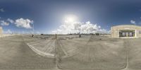 Aerial view of Miami Beach, Florida. The photo captures a parking lot with a building in high position. The reflection of the building adds a unique touch. Straight down the road, the surface of the parking lot contrasts with the clear sky above.