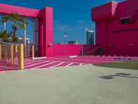 In the heart of Miami Beach's art district, a vibrant pink building stands out against the clear blue sky. The urban design and concrete surfaces create a unique atmosphere. Experience the energy of city life in Miami.