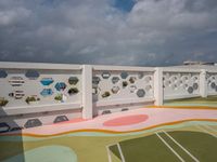 This image showcases the colorful rooftop of an outdoor play area for children in Miami Beach, Florida. The urban art district provides a vibrant backdrop to the city landscape. The gloomy grey sky adds a contrast to the colorful surface of the rooftop. The urban design of the city is visible in the parking lot below. This photo represents a day in the vibrant city life of Miami Beach, USA.