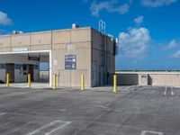 a parking lot with an air conditioning unit in the background and some clouds in the sky