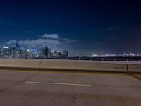 This photo captures the vibrant cityscape of Miami, Florida, USA at night. The image features an empty street with a bridge in the foreground and the city skyline in the background. The dark night sky contrasts with the illuminated skyscrapers, creating a captivating urban design. The coastal location of Miami Beach is visible, with the ocean and water adding to the scenic beauty of the scene. This photo represents the urban atmosphere and architectural marvels of the city of Miami.