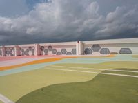 the sky is dark and cloudy over the large building and wall paint that was painted by children