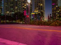 a purple glow from a street light over a street with tall buildings in the background