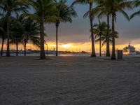 the sun is setting over the harbor with palm trees and a statue in the foreground