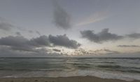 the view of a beach from an ocean side cliff at sunset in india, with clouds and sun shining on the horizon