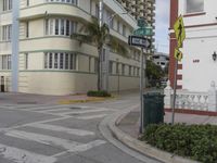 a city intersection with a street sign and a palm tree in the middle of the street