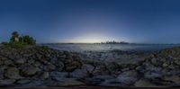 The vibrant city of Miami Beach, Florida, comes alive at night as the city skyline reflects in the calm ocean waters. The sun sets, casting a warm glow on the skyscrapers, creating a stunning urban design. A perfect blend of city life and coastal beauty.
