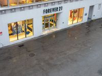An aerial view of a store front in Miami Beach, Florida. The wet ground below reflects the modern architecture of the city. Urban design and top down view depict the hustle and bustle of city life.