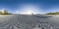 A sunny day in Miami Beach, Florida. The beach stretches along the coastal landscape, with urban buildings in the distance. The sun is visible behind a building, creating a beautiful profile against the ocean. Enjoy the open space and straight road leading to the shore.