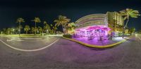 an upside down fish eye shot shows the restaurant, palm trees, and beach lights