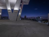 An empty parking space near a bridge in Miami Beach, Florida. The dark night sky contrasts with the artificial light illuminating the concrete surface. A quiet spot in the city.