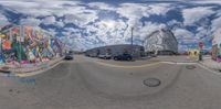 Fish-eye lens captures a unique view of a side street in Miami Beach. The grey sky adds a gloomy atmosphere to the colorful graffiti walls. Urban design and architecture blend with the vibrant city life.