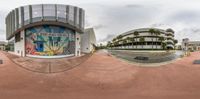 An aerial view of Miami Beach, Florida, showcasing the city's modern architecture and urban design. Grey skies and wet concrete streets create a gloomy atmosphere. Numerous shops and restaurants line the streets, offering a vibrant city life experience.