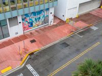 An aerial view of Miami Beach's vibrant and modern urban design. The pink-painted streets are lined with shops and storefronts, while a colorful mural adds artistic flair. The city's top-down view showcases its unique architecture and the sparkling water nearby.