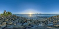 a view out to the water from behind rocks, which are scattered with trees and tall buildings in the distance