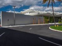 A view of a bridge in Miami, Florida against a clear sky. The urban design of the bridge adds to the cityscape of Miami Beach. The road's asphalt reflects the hard shadows created by the clouds.