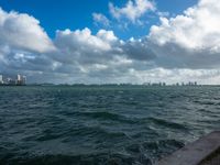 a large body of water with city buildings in the distance and clouds hovering overhead above