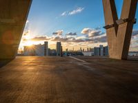 A straight view down the road in Miami Beach, Florida. The city skyline and skyscrapers rise above the urban concrete surface. The sunny dawn breaks over the cityscape, with open spaces and a parking lot. A vibrant urban design under the visible sun.