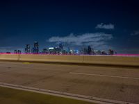 A dark night in Miami, Florida, with city lights streaking in the background. Overpasses on the highway create motion blur, leading into a freeway. Miami's urban skyline and coastal views add to the city's vibrant atmosphere.