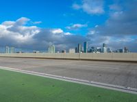 a highway sign and building against a blue sky and white clouds in miami florida with the city skyline seen behind